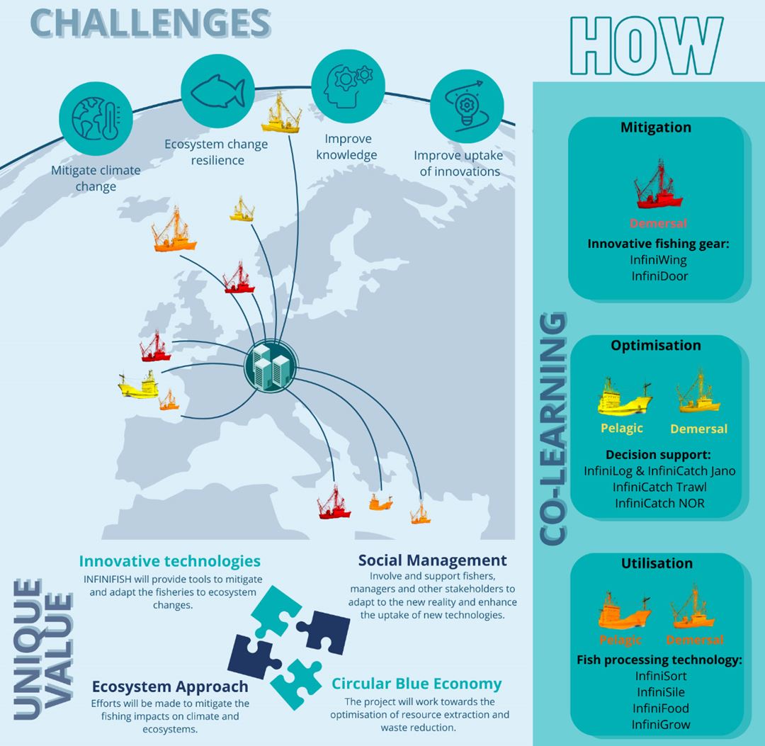 Infinifish (Infinifish.eu) creates innovations to monitor and mitigate the impacts of fishing on the climate and enable fisheries to adapt to the consequences of climate change. Infinifish develops and validates technological solutions for the entire fisheries value chain, such as: